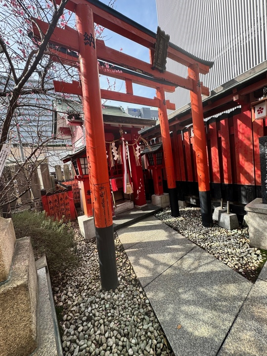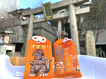 最近は「ゴジラお守り」も登場していました!(初回の授与は終了していて、2月下旬の土・日に順次増体予定だそうです)境内の梅の花もそろそろほころびはじめました。  梅田に来られたら、ぜひ!